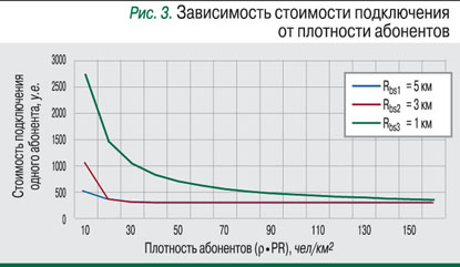 При росте плотности населения на территории действия сети стоимость подключения одного абонента падает. Предел, к которому стремится стоимость подключения абонента, зависит от требуемой абонентами скорости передачи данных (см. п. 2).