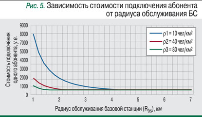 Еще один важный фактор для операторов - возможности технологии по дальности обслуживания абонентов, или, в терминах модели - радиус действия базовой станции. Согласно результатам моделирования, с ростом дальности стоимость подключения быстро уменьшается (обратная квадратичная зависимость, рис. 5). В районах с высокой плотностью населения дальность связи не так важна, поскольку определяющим фактором становится пропускная способность сети.