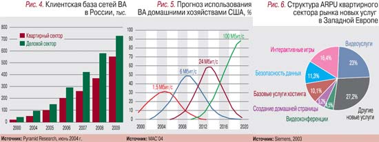 В России наблюдаются те же тенденции: рост клиентской базы сетей широкополосного доступа с превалированием делового сектора (рис. 4). По данным J`son & Partners, в России уже в 2004 г. насчитывалось около 3,5 млн пользователей широкополосного доступа (правда, термин «широкополосный» в данном случае отнесен к доступу на скоростях выше 128 кбит/с).