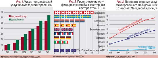 В настоящее время в квартирном секторе даже в странах Евросоюза степень проникновения фиксированного широкополосного доступа (Broadband Access – BA) существенно различается. Так, в 2004 г. в Швейцарии 31% домашних хозяйств имели широкополосный доступ, тогда как в Греции он практически отсутствовал; средний показатель по Европе – 17% (рис. 2). Однако по прогнозам, до 2008 г. почти половина домашних хозяйств в Западной Европе будет подключена к сетям широкополосного доступа (рис. 3).