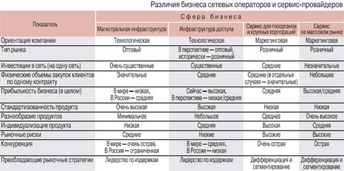 Соответственно, все большую значимость для успеха бизнеса приобретает маркетинговая составляющая, рассматривающая услугу не как продукт сети связи, а как объект продажи. Бизнес-модели оператора сети и сервис-провайдера принципиально различны (см. таблицу). - В условиях возрастающей конкуренции одним из существенных требований пользователя становится возможность получения разнообразных услуг (как собственно услуг связи, так и информационных сервисов, для которых услуги связи являются средством доступа) в одном месте, используя «одно операционное окно». Возникает объективная необходимость перепродажи услуг связи. В зарубежной практике появилась и успешно развивается категория виртуальных операторов, не располагающих серьезной сетевой инфраструктурой, но имеющих возможность комплексировать сервисы, закупаемые по оптовым ценам у сетевых операторов, и перепродавать их в виде пакетов услуг конечным пользователям под собственной торговой маркой. При этом виртуальный оператор может добавить в сервисный пакет значительное количество организованных им самим телекоммуникационных и нетелекоммуникационных сервисов. Это один из способов реализации рыночной направленности современного процесса продажи услуг.