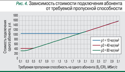 При росте плотности населения на территории действия сети стоимость подключения одного абонента падает. Предел, к которому стремится стоимость подключения абонента, зависит от требуемой абонентами скорости передачи данных (см. п. 2).