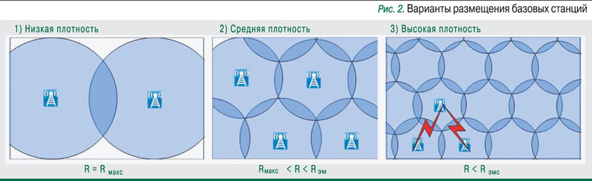 При размещении базовых станций на местности в зависимости от требуемой плотности возможно использование трех вариантов (рис. 2).