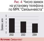 Достигли мы пика проникновения фиксированных сетей? Ведь сегодня его уровень поднялся чуть ли не до 30%. Существует ли в России потенциал роста фиксированных линий? Ответ – безусловно да. Вопрос – на сколько? Нижней планкой могут служить 2,5–3 млн каналов (общее число линий – 45 млн, проникновение – 32%). Именно столько заявок на установку телефона было подано год назад в 7 МРК «Связьинвеста» (рис. 4), которые в совокупности обслуживают около 70% всех фиксированных линий страны. Верхний же предел, исходя из мирового опыта, находится где-то на уровне 8 млн (суммарно – 50 млн линий, проникновение – 35%).