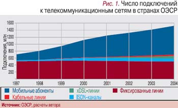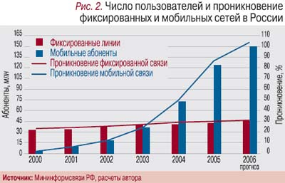 Как уже упоминалось, развитие отечественного телекоммуникационного рынка происходило в условиях, когда начальное развитие наших фиксированных сетей было значительно ниже, чем в развитых странах (проникновение в начале 90-х годов – около 15%). В то же время стремительное развитие мобильной связи за последние 5 лет подтянуло Россию к передовым государствам (рис. 2). Характерно, что число фиксированных сетей продолжает уверенно расти, хотя и несколько замедленными темпами (прирост в 2003 г. – 2,3 млн линий, в 2005 г. – 1,4 млн).