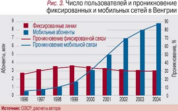 Нельзя забывать о том, что Россия – полноправный член мирового мобильного «клуба» и порой целесообразнее воспользоваться сотовой связью, нежели тянуть домой медную пару. И здесь весьма характерен пример Венгрии, от которой мы на 2–3 года отстаем по уровню доходов и мобильного проникновения. Несмотря на относительно низкий уровень проникновения фиксированной связи (35% в 1999 г.), число голосовых линий начало снижаться и показатель опустился до 30% (рис. 3).