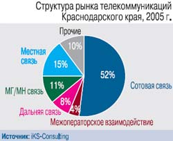 Рынок дальней связи, где главенствует ЮТК (93% от общих доходов рынка), медленно сокращается: в 2005 г. – на 4%, и в 2006 г. вряд ли прирастет. Ведь курортники звонят все больше по сотовому телефону, благо, сети крупнейших операторов здесь имеются. Объем услуг внутризоновой связи сократился за 2005 г. на 2%, так как местному казаку сподручней доехать на коне до соседней станицы и обстоятельно побеседовать с товарищами.