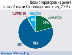 Местный рынок связи занимает 6-е место среди регионов России. В 2005 г. он прирос на целых 57% и достиг $630 млн, а в нынешнем приблизится к миллиардному рубежу. Впрочем, в пересчете на одного пользователя показатели скромные: один кубанец тратит на связь $10 в месяц, на $4 меньше, чем в среднем по стране. Непросто опутать стеклом и медью столь обширную территорию. Проникновение фиксированной связи в крае 23% (на 5% ниже среднероссийского); телефон отсутствует в 2% краснодарских сел. Очередников на установку телефона – 50 тыс. человек, 1% населения. Настоящий атаман фиксированной связи – ЮТК. Традиционный оператор обслуживает 89% кубанцев. Ближайший за ним оператор «Кубинтерсвязь» с долей рынка 1,3% тянет на сотника или есаула. Есть и засланные казачки: «Голден Телеком», освоившись на местном рынке через «дочку» «Телеросс-Кубаньэлектросвязь», потянулся поближе к морю и приобрел «Сочителеком»; обосновался на курорте и «Комстар». Более $1 млн на этом рынке зарабатывают, помимо ЮТК, только «Голден Телеком» и «Кубинтерсвязь», да у «Комстара» теперь появится такая возможность.