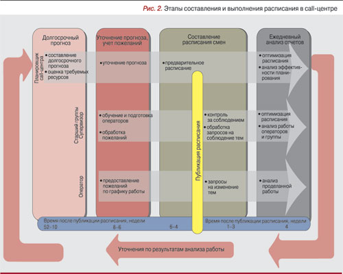 Планировщик отвечает за весь процесс планирования и составления расписания. Старший группы контролирует работу подчиненных ему операторов и предоставляет планировщику необходимую информацию. Операторы отвечают за соблюдение графика работы, предоставляя свои пожелания по изменению смен старшему группы.Работа над составлением расписания начинается с определения нагрузки на период планирования – на год или поквартально – для формирования бюджета работы call-центра, подготовки плана набора и обучения персонала.