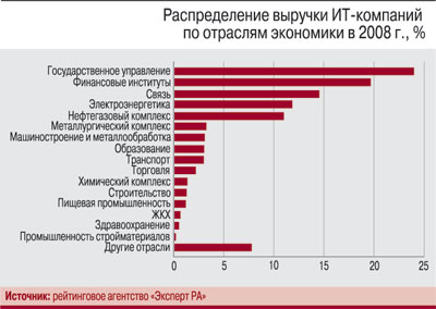В 2009 г., по прогнозам ИК «Финам», доля госсектора в ИТ увеличится до 30%, что обусловлено, с одной стороны, активизацией госструктур в области внедрения ИТ-решений, с другой – стремлением ИТ-компаний получить государственные контракты, дающие определенные гарантии финансирования проектов, что в период кризиса особенно важно.