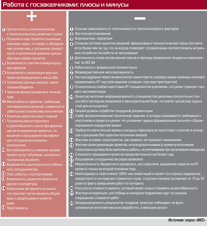 ИКТ-бизнес, присматриваясь и прислушиваясь к событиям в политических верхах, делает между тем свое каждодневное дело: телефонизирует, интернетизирует, автоматизирует, защищает. При этом десятки и сотни проектов выполняются в интересах госструктур за рамками каких бы то ни было целевых программ – на основе контрактов, выигранных в конкурсах и на аукционах. Из 20 экспертов, принявших участие в подготовке этого номера «ИКС», ни один не усомнился в перспективности госсектора как заказчика, особенно в кризисное время, хотя, как показал наш опрос, минусов в работе с госпроектами оказалось все же больше, чем плюсов.