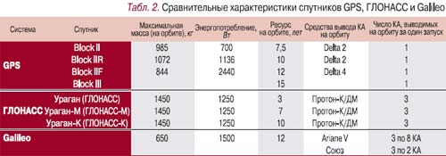 Все три системы имеют сходную архитектуру. У каждой по три основных сегмента – космический, наземный комплекс управления и приемники потребителей. Спутники располагаются на средних высотах – примерно 20 000 км. Такой переход с низких орбит первых систем позволил избежать влияния земной атмосферы, т.е. создал условия длительного функционирования без коррекции орбиты. Конфигурация орбитальной структуры (по нескольку спутников в разных плоскостях) обеспечивает глобальную непрерывную зону покрытия. Различия же – главным образом в технической реализации космического и наземного сегментов (табл. 2).