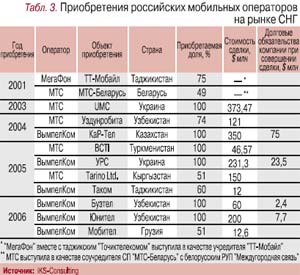 М. САВВАТИН: Экспансия российских сотовых компаний в страны СНГ началась пять лет назад. За это время наши операторы приобрели в 8 странах СНГ активов на сумму около $1,4 млрд. «ВымпелКом» имеет действующие сети в Украине, Казахстане, Таджикистане и Узбекистане, готовится к запуску сеть в Грузии. МТС предоставляет свои услуги в Украине (оператор UMC), Беларуси, Узбекистане и Туркменистане. В наступающем году ожидаю продолжения наступления в том же направлении. Среди еще не охваченных перспективных рынков можно выделить Молдову, Армению и Азербайджан. Уровень проникновения сотовой связи там колеблется от 35 до 45%, а на рынке – по 2 GSMоператора. В следующем году при приобретении операторами новых активов на рынках СНГ затраты в пересчете на одного абонента составят не менее $600–700 (табл. 3). Ожидания-2007