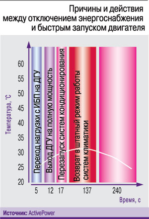 Самый простой и эффективный способ снизить тепловое воздействие в дата-центре (предотвратить состояние, когда серверы перегреваются и отключаются из-за прерывания питания), состоит в сокращении времени, которое требуется для восстановления питания систем охлаждения (механических систем). Один из способов добиться этого – уменьшить время отправки сигнала включения резервному двигателю. Однако, по данным EPRI (Электроэнергетический научно-исследовательский институт США), почти 99% всех случаев отключения электричества длятся менее 10 с. Поэтому, чтобы предотвратить так называемый ложный запуск, т.е. получение двигателем сигнала о включении даже в том случае, когда энергоснабжение восстановилось в течение нескольких секунд после первоначального отключения, необходимо установить задержку в 5–10 с. В правильно разработанных системах энергоснабжения с высокой доступностью дизельный двигатель должен включаться и принимать нагрузку через 5–6 с после получения команды.