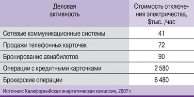 Можно ожидать, что в конечном счете будут построены новые генерирующие предприятия и случаи тотального нарушения энергоснабжения на большой территории станут относительно нечастыми. Но его периодическое отключение, перепады напряжения и отклонения по частоте продолжают представлять угрозу для работы критически важных систем. В большинстве случаев финансовые последствия отключения систем энергоснабжения бывают весьма серьезными (см. таблицу).
