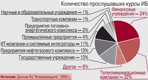 Что мы оценивали В первую очередь мы попытались выяснить, какие из отраслей наиболее ревностно относятся к подготовке кадров. Для этого мы запросили относительные данные по количеству прослушавших курсы ИБ у одного из наиболее популярных на российском рынке «просветителей» – Учебного центра «Информзащита». Данные относятся к 2006 г., но, по словам руководителя центра З. Поповой, статистика практически не менялась за все восемь лет существования УЦ.