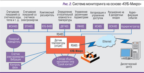 В качестве примера можно привести систему мониторинга, выполненную на основе контроллера «КУБ-Микро» (рис. 2), обеспечивающую контроль объекта в режиме реального времени и передачу сообщений оперативному персоналу о возникающих аварийных ситуациях (открытии дверцы, попытке взлома, выходе значений температуры и влажности внутри шкафа за установленные пределы, затоплении и пожаре, пропадании внешнего электропитания и пр.).