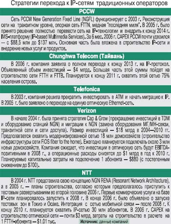 Например, для перевода своей сети на IP протокол British Telecom решилась на ежегодные инвестиции до 2010 г. в размере $3,8–5,8 млрд для замены почти 30 млн абонентских линий и переоснащения около 70 центров технической эксплуатации. И это в то время, когда долговое бремя этого национального оператора на конец 2006 финансового года составляло более $39,6 млрд, из которых в текущем году необходимо выплатить почти $6 млрд. Выбор стратегии миграции к IP'сетям