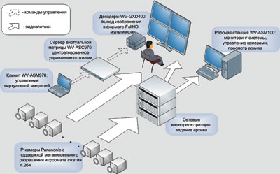 До недавнего времени на основе оборудования Panasonic было невозможно создать крупную распределенную систему, где каждый оператор может видеть картинку с любой из камер. Это было обусловлено отсутствием компонентов для связи подсистем, находящихся в разных сетях. Проблему решила вышедшая в начале 2010 г. виртуальная матрица WV-ASC970. Этот серверный программный продукт, работающий под управлением ОС Linux, предоставляет возможность управления как сетевыми регистраторами, так и аналоговым оборудованием (цифровыми рекордерами и матричными коммутаторами Panasonic). Также в системе, оснащенной виртуальной матрицей, расширяются возможности сетевого контроллера WV-CU950, по виду представляющего собой привычный для большинства операторов пульт управления системой видеонаблюдения. От пультов в аналоговых системах, которые работают по протоколу RS-485, он отличается тем, что подключается непосредственно в сеть Ethernet. В системе с виртуальной матрицей может использоваться многоканальный декодер для вывода изображения на монитор без компьютера (например, на плазменную панель), что позволяет создать классическое рабочее место оператора видеонаблюдения, состоящее лишь из пульта управления и монитора.