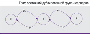 Для доказательства высокой проектной оценки надежности часто применяют следующий «удобный» расчет дублированной группы серверов. Используется марковская цепь, приведенная на рисунке. В качестве параметров модели задаются интенсивности отказов λ и восстановления µ. Отказом считается выход из строя обоих узлов: состояние «2».