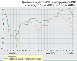 За период с 15 мая по 1 июля индекс ММВБ снизился на 7,2% до 1254,65 пункта, а индекс РТС – на 10,6%, достигнув отметки 1288,72 пункта. Наиболее динамичным для фондового рынка оказался май, когда на российском и мировом рынках господствовали негативные тенденции, обусловленные долговыми проблемами в Греции и других странах еврозоны. На фоне сохраняющихся рисков ухудшения ситуации в мировой экономике не стал позитивным для инвестиционного сегмента и июнь. Так, индекс «ММВБ телекоммуникации» (MICEX TLC) за месяц потерял 2,2%, достигнув отметки 1895,23 пункта, а индекс «РТС Телекоммуникации» (RTStl) подешевел на 2,8% до 197,54 пункта.