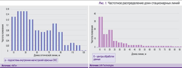 Статистика реализованных проектов (рис. 1) свидетельствует о том, что независимо от области применения протяженность примерно 90% линий СКС не превышает 100 м. Поэтому для обеспечения 40- и 100-гигабитной пропускной способности канала связи целесообразно организовывать передачу в нескольких параллельных субканалах. Такой подход дает возможность в разы уменьшить тактовую частоту линейного сигнала.