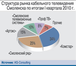Особенность смоленского рынка кабельного телевидения состоит в том, что проникновение этой услуги в городе выше, чем проникновение ШПД – 38%. К тому или иному оператору КТВ подключены 47,7 тыс. домохозяйств Смоленска. Лидерство в сегменте принадлежит компании «Комстар-ОТС», обслуживающей более трети всех абонентов. Конкурентная ситуация в сегменте более напряженная, чем на рынке ШПД: в городе присутствуют несколько крупных операторов, проникновение услуги выше, чем в других крупных городах ЦФО (например, Воронеже и Липецке). В I квартале 2010 г. ARPU составил 132 руб., это одно из самых низких значений в ЦФО.