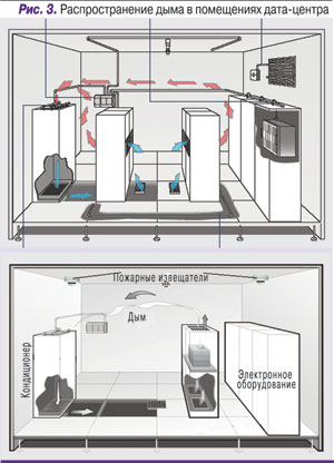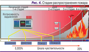 Можно также установить среднюю чувствительность, и при этом система будет определять момент сильного задымления помещения, когда сложно найти место или оборудование, являющееся причиной задымления. При превышении данного порога чувствительности можно запрограммировать систему на отключение кондиционеров. Самую низкую чувствительность устанавливают для уровня задымленности помещения, когда предотвратить дальнейшее распространение пожара невозможно без систем активного пожаротушения. При достижении данного порога чувствительности программируется включение системы газового пожаротушения (рис. 4).