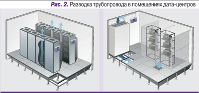 Как правило, оборудование дата-центров находится в закрытых шкафах, поэтому наиболее эффективным решением для защиты этих зон является отбор проб из шкафов. В случае аспирационных систем в дата-центрах трубки с всасывающими отверстиями проводят поверх стоек с установленным оборудованием. Гибкая система трубок позволяет отбирать пробы как над шкафами, так и внутри них с помощью капилляров, обеспечивая максимально надежное обнаружение дыма в полностью закрытых шкафах, равно как и в шкафах с верхней вентиляцией (рис. 2).