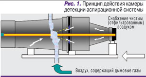 Проба воздуха поступает в калиброванную камеру извещателя, в которой через нее проходит луч лазера. При наличии в воздухе частиц дыма наблюдается рассеивание света внутри камеры, и это немедленно обнаруживается высокочувствительной приемной системой (рис. 1). Затем сигнал обрабатывается и отображается на гистограммном дисплее, пороговых индикаторах срабатывания сигнализации и/или графическом дисплее. Чувствительность извещателя можно регулировать, а поток воздуха непрерывно контролируется на предмет