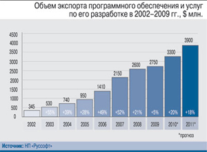 Но, несмотря на такую «помощь» государства, рост объема экспорта ПО в России продолжается. Согласно исследованиям «Руссофта» (см. диаграмму), резкое замедление (но не прекращение) этого роста произошло лишь в 2009 г. (до 5%, тогда как в 2008 г. он составлял 21%). Имеющиеся данные дают «Руссофту» основания прогнозировать, что в нынешнем году рост экспорта ПО достигнет 20%. Остается только гадать, каким бы он был, если бы не усиление налогового пресса.