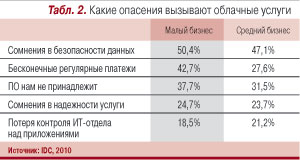Что касается сдерживающих факторов, то сегодня существует целый ряд мифов (а может быть, и не мифов — рынок еще слишком молод, чтобы делать окончательные выводы), смущающих потенциальных пользователей этой услуги. В первую очередь все опасаются за безопасность данных (табл. 2). Когда данные хранятся в офисе компании, на ее физическом сервере, в общем понятно, как они защищены и какие риски связаны с их хранением. Когда они хранятся на сервере провайдера, который к тому же может находиться где-то за рубежом, для многих совсем неочевидно, как провайдер защищает эти данные и какую ответственность несет за их сохранность. Для многих это опасение становится серьезным препятствием к тому, чтобы сделать выбор в пользу облачных услуг. На наш взгляд, проблема эта в первую очередь психологическая: люди не готовы признать, что провайдер, который профессионально занимается предоставлением услуги, может намного лучше обеспечить сохранность их данных, чем они сами. Но такая предубежденность оказывается очень распространенной.
