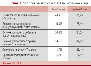 Как показали результаты опроса, и малый, и средний бизнес в первую очередь ценят возможность использовать именно тот объем услуг, который реально нужен компании, и платить только за этот объем (табл. 1).