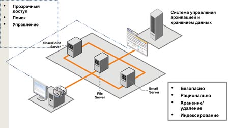 В России архивирование с использованием систем управления хранением данных уже приносит свои плоды, рассказывает начальник управления корпоративных разработок ОАО «Магнитогорский металлургический комбинат», Вадим Феоктистов: «Необходимость разделения всего массива корпоративной корреспонденции на оперативную часть, хранящуюся непосредственно в почтовой системе, и архивную составляющую, вызывает к жизни целый ряд задач, успешное решение которых и является показателем эффективности построения архива. Самая главная из них – это «бесшовное» соединение оперативной и архивной частей массива корреспонденции, то есть такая организация работы пользователя, при которой граница, существующая между этими частями, не будет доставлять ему каких-либо неудобств. Почтовые сообщения из архива по-прежнему находятся в зоне доступа, хотя открываются чуть дольше, работа с ними по-прежнему осуществляется через MS Outlook. «За сценой» остаются сложные механизмы системы архивирования, обеспечивающие 100% защиту почтовых сообщений от сбоев и искажений при перемещении в архив, средства оптимизации хранения, позволяющие сжимать данные и другими способами добиваться сокращения объема архива, развитые средства поиска в архиве, поддержка мобильных пользователей, управление авторизацией и доступом, и многое другое. В нашем случае был выбран Enterprise Vault для реализации архива и Storage Foundation/HA для обеспечения отказоустойчивости с помощью кластерной организации вычислительных ресурсов системы архивирования».
