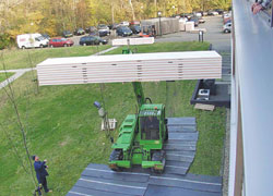 Особо отметим, что конструкционная длина сэндвич-панелей составляет от 2500 до 12000 мм. Применение панелей длиной свыше 6000 мм требует специальных грузовых терминалов вплоть до устройства монтажных проемов в стенах здания и специальных подъемных и транспортировочных механизмов (рис. 4).