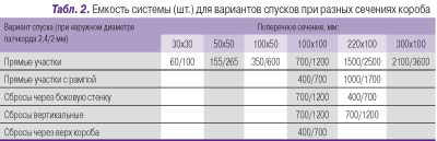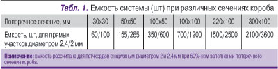 В табл. 1 приведены усредненные данные расчетов емкости прямых отрезков короба. Здесь необходимо заметить, что большинство производителей указывает подобную информацию для случая 60%-ного заполнения сечения короба, исходя из комфортного режима эксплуатации и несущей способности прямого участка.