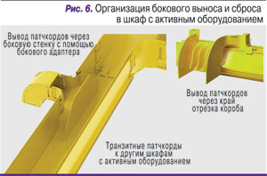 Вариант спуска через боковую стенку позволяет вывести требуемое количество шнуров с одновременным пропуском транзитных патчкордов к другим шкафам в зале. В этом случае пучки выходящих и транзитных патчкордов пространственно разделены, что позволяет наилучшим образом провести их выкладку.Немного о безопасности