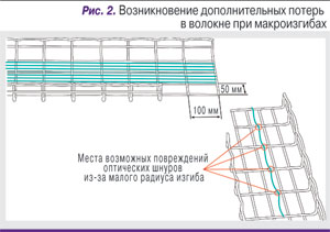 Традиционно медножильная проводка в обоих вариантах расположения размещается на сетчатых лотках различного поперечного сечения. Конструкцию лотка рассчитывают таким образом, чтобы она выдержала большой вес медного кабеля. Используется проволока сечением от 4 до 7 мм – в зависимости от сечения лотка и его несущей способности. Оптическое волокно по своей природе создает дополнительные потери вследствие микро- и макроизгибов (рис. 2). Поскольку размер ячейки проволочного лотка довольно велик (как правило, 50×100 или 70×120 мм), макроизгибы обусловлены перегибом оптического кабеля через каждую проволоку в составе лотка. Таким образом, при большом количестве патчкордов на лотке верхние слои будут оказывать давление на нижние, дополнительно увеличивая затухание в оптическом тракте.