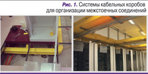 Один из возможных вариантов реализации специальных систем прокладки кабеля – кабельнесущие решения на основе пластиковых коробов (рис. 1). Сочетание прямых отрезков короба и более сложных элементов (вертикальных и горизонтальных углов, спусков и т.п.) позволяет проложить оптический тракт практически любой сложности и геометрии, а также разными способами монтажа (расположение над стойками или под фальшполом).