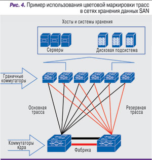 В качестве примера использования цветовой кодировки рассмотрим построение простейшей отказо-устойчивой коммутируемой фабрики SAN (рис. 4). Представленная на рисунке сеть имеет топологию "центр-периферия" (core-to-edge), производную от популярной в телекоммуникациях топологии «звезда». Коммутаторы ядра соединяются с граничными коммутаторами, формируя основу для фабрики Fibre Channel. Исходя из распределенной архитектуры сети, можно предположить, что линки от каждого коммутатора ядра к каждому граничному коммутатору должны идти по независимым маршрутам, с тем чтобы повысить независимость каждого плеча проектируемой системы. Прокладка кабельной проводки от каждого плеча (коммутатора ядра) по системе коробов разного цвета существенно упрощает идентификацию физических маршрутов трасс в помещении ЦОДа.