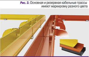Поскольку требования к отказоустойчивости кабельной инфраструктуры в помещениях машинных залов ЦОДов непрерывно повышаются, приходится создавать резервные кабельные трассы. Размещение основных и резервных кабельных проводок в одном и том же коробе противоречит прописанному в стандартах требованию пространственного разделения основных и резервных кабельных трасс. Резервная трасса должна прокладываться по отдельной независимой системе коробов. Маркировка резервной и основной трасс разными цветами (рис. 3) упрощает визуальную идентификацию элементов инфраструктуры в помещении машинного зала.