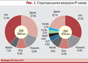 Объем мирового рынка IP-камер, по данным IMS Research, в 2009 г. составил $733 млн, из которых 31,2% принадлежит Axis, 14,9% – Panasonic, 10,2% – Sony (рис. 1). Заметим, что на долю сетевых камер, по экспертным оценкам, приходится почти 50% рынка IP-видеонаблюдения. В трех других его сегментах – видеосерверы, сетевые видеорегистраторы на основе встроенного циклора и сетевые видеорегистраторы на основе программного обеспечения – наиболее весомая доля приходится на видеосерверы (более 30%). Кроме того, построение сети IP-видеонаблюдения сопряжено с сопутствующими расходами, в связи с чем суммарный объем рынка разные аналитики оценивают по-разному. Тем не менее при оценке рынка аналитики берут за основу его ключевой сегмент – IP-камеры. Лидерство в этом сегменте шведская компания Axis держит с момента его зарождения: именно она первой внедрила сетевые видеотехнологии в профессиональные системы охранного и удаленного видеонаблюдения, создав в 1996 г. первую в мире сетевую камеру, и сегодня, по данным компании, более миллиона произведенных ею камер IP-видеонаблюдения установлено по всему миру. По словам Л. Полссона, директора по региону ЕМЕА компании Axis Communications AB, продажи в 2009 г., несмотря на кризис, росли во всем мире, причем среди развивающихся рынков российский признан самым перспективным: по оценке компании, в 2010 г. доля России в ее продажах в регионе ЕМЕА составит 43%.