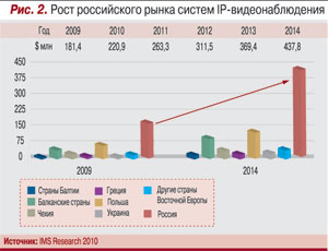 Следует отметить, что Россия – крупнейший покупатель систем IP-видеонаблюдения: в общемировую копилку ($733 млн) она вложила в 2009 г. 181,4 млн. В 2010 г., по прогнозу IMS Research, будет на 20% больше – 220,9 млн (рис. 2).