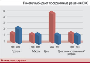 Характерно, что если в 2009 г. большинство участников опроса, который мы провели среди своих заказчиков, покупали программные решения ВКС главным образом из-за низкой стоимости (см. рисунок), то в этом году цена перестала играть решающую роль, и более важным для заказчиков становится фактор простоты внедрения системы. Действительно, развертывание сервера занимает 10 мин, настройка клиента еще 5 мин – и можно работать, причем это будет полноценное клиент-серверное приложение внутри корпоративной сети. К слову, еще один плюс софта – всегда можно попробовать, причем это очень просто: только что подумал, через пять минут систему скачал, через десять посмотрел. Не понравилось – отказался.