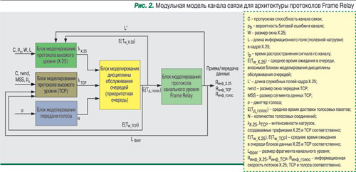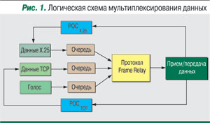 Для минимизации времени доставки трафика данных реального времени – голоса и видео – крупные блоки данных от протоколов Х.25 и ТСР/IP подвергаются фрагментации. Это позволяет уменьшить время ожидания в очереди на передачу через канал связи по протоколу Frame Relay. Для протоколов, обеспечивающих гарантированную доставку информации через сеть, применяется процедура решающей обратной связи (на рис. 1 – РОСХ.25 и РОСТСР соответственно). При такой схеме мультиплексирования информационная скорость передачи для отдельно взятого канала будет складываться из информационных скоростей для каждого типа трафика – Х.25, ТСР и голоса.