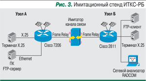 Адекватность модели проверялась на имитационном стенде ИТКС-РБ (рис. 3), который позволяет организовывать передачу голосового трафика (одно–три телефонных соединения), трафика TCP (передачу данных по протоколу FTP) и трафика Х.25. В качестве мультисервисного протокола канального уровня используется Frame Relay. Имитация канала связи осуществляется программными средствами, что дает возможность варьировать параметры линии связи (пропускную способность, вероятность битовой ошибки, время задержки при передаче по каналу).