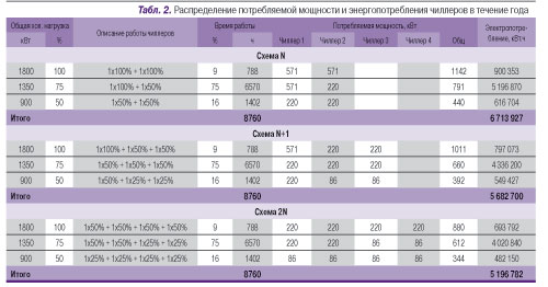 Рассматривалось резервирование чиллеров по трем схемам: N (без резервирования), N+1 и 2N при N = 2. Алгоритм работы схемы с двумя чиллерами по 1800 кВт каждый состоит в следующем. При максимальной нагрузке работают оба чиллера при 100%-ной мощности. При снижении нагрузки до 75% один чиллер продолжает работать на 100%, а второй снижает про-изводительность до 50%. При снижении общей нагрузки до 50% в работе задействованы оба чиллера с 50%-ной нагрузкой каждый (вместо работы одного чиллера на 100%).Алгоритм работы по схеме резервирования N+1 и 2N аналогичен предыдущей схеме с тем отличием, что нагрузка распределяется с учетом резервных чиллеров.