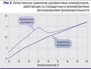 При параметрах нагрузки от 12 до 50% одна сторона винтового компрессора остается в полностью разгруженном состоянии, в то время как золотник на второй стороне перемещается в положение, соответствующее требованиям нагрузки. Для нагрузок в пределах 62–100% верхняя часть полностью загружена, а нижняя часть отрегулирована таким образом, чтобы обес-печивать точное соответствие параметрам загрузки.В результате эффективность одновинтового компрессора с ассиметричным регулированием производительности в режиме частичной нагрузки будет выше, чем при стандартном регулировании (с симметричным перемещением золотников). Как видно из рис. 2, при ассиметричном регулировании с уменьшением нагрузки коэффициент энергетической эффективности (COP) компрессора увеличивается по сравнению с симметричным регулированием, и наибольшее значение достигается при 50%-ной загрузке компрессора. Этот режим соответствует поло-жению золотников компрессора, когда один золотник полностью разгружен, а второй полностью нагружен.