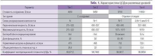 В соответствии со стандартом США ANSI/EIA/TIA-942 ЦОДы делятся на четыре класса (табл. 1). Каждый класс характеризуется минимальным коэффициентом эксплуатационной готовности: этот показатель определяет вероятность безотказной работы оборудования ЦОДа в заданный период времени. Для обеспечения необходимого коэффициента эксплуатационной готовности с целью повышения надежности системы в каждом классе ЦОДов предусмотрены определенные схемы резервирования оборудования.