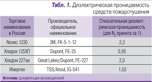 При выборе огнетушащего вещества необходимо также учитывать специфику помещения, где оно будет использоваться. В нашем случае это помещение дата-центра с размещенным в нем высокотехнологичным оборудованием, имеющим электронную начинку, а для защиты помещений с электронным и электротехническим оборудованием крайне важен такой параметр, как диэлектрическая проницаемость ГОТВ. Для оценки диэлектрических свойств различных огнетушащих веществ их принято сравнивать с изолирующими свойствами осушенного азота (см. табл. 1).